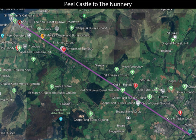 This line starts from the chapel inside Peel Castle and follows the the Serpent Line that flows through the central valley and Manannan’s Belt line. Heading East, it crosses over the following: Finally ending at The Nunnery.